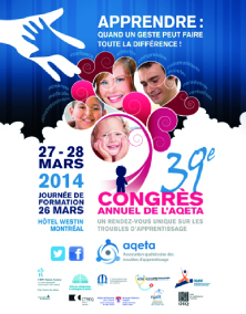 Du mercredi 26 au vendredi 28 mars 2014 se tiendra le 39e Congrès annuel de l'Association québécoise des troubles d'apprentissage (AQETA) à Montréal. Placé sous le thème « J'ai un trouble d'apprentissage, comment pouvez-vous m'aider ? », l'événement offrira des formations et présentera des conférences et des symposiums. Près de 1800 professionnels de l'éducation sont attendus (psychoéducateurs, orthopédagogues, psychologues, enseignants, éducateurs...) ainsi que des parents.